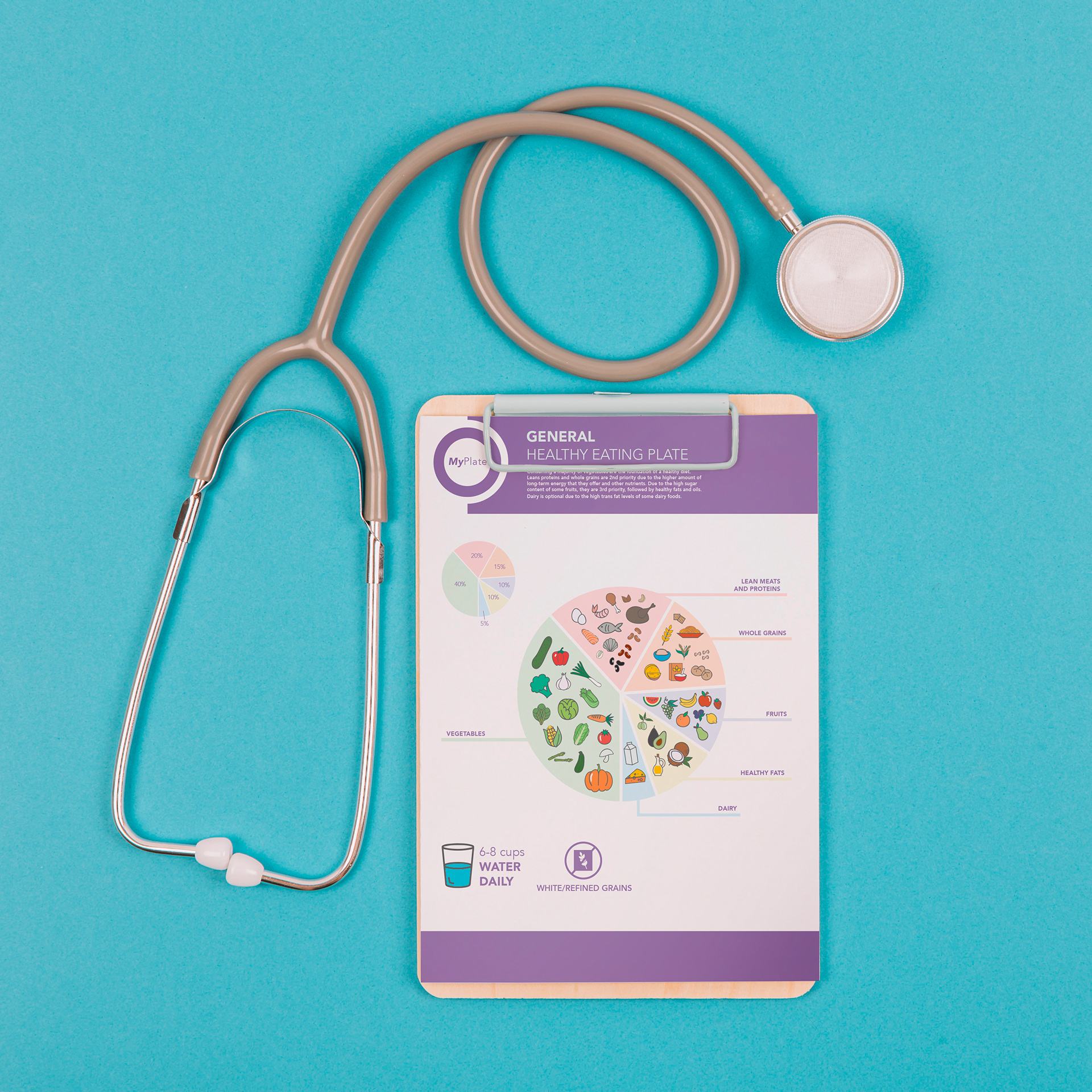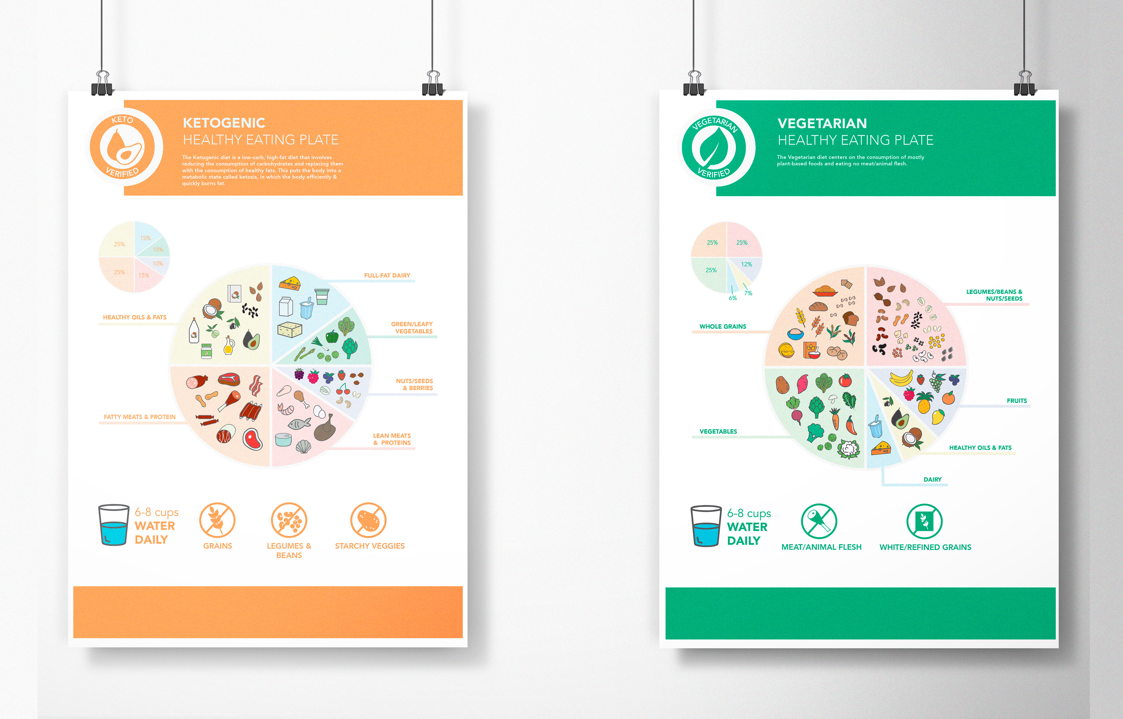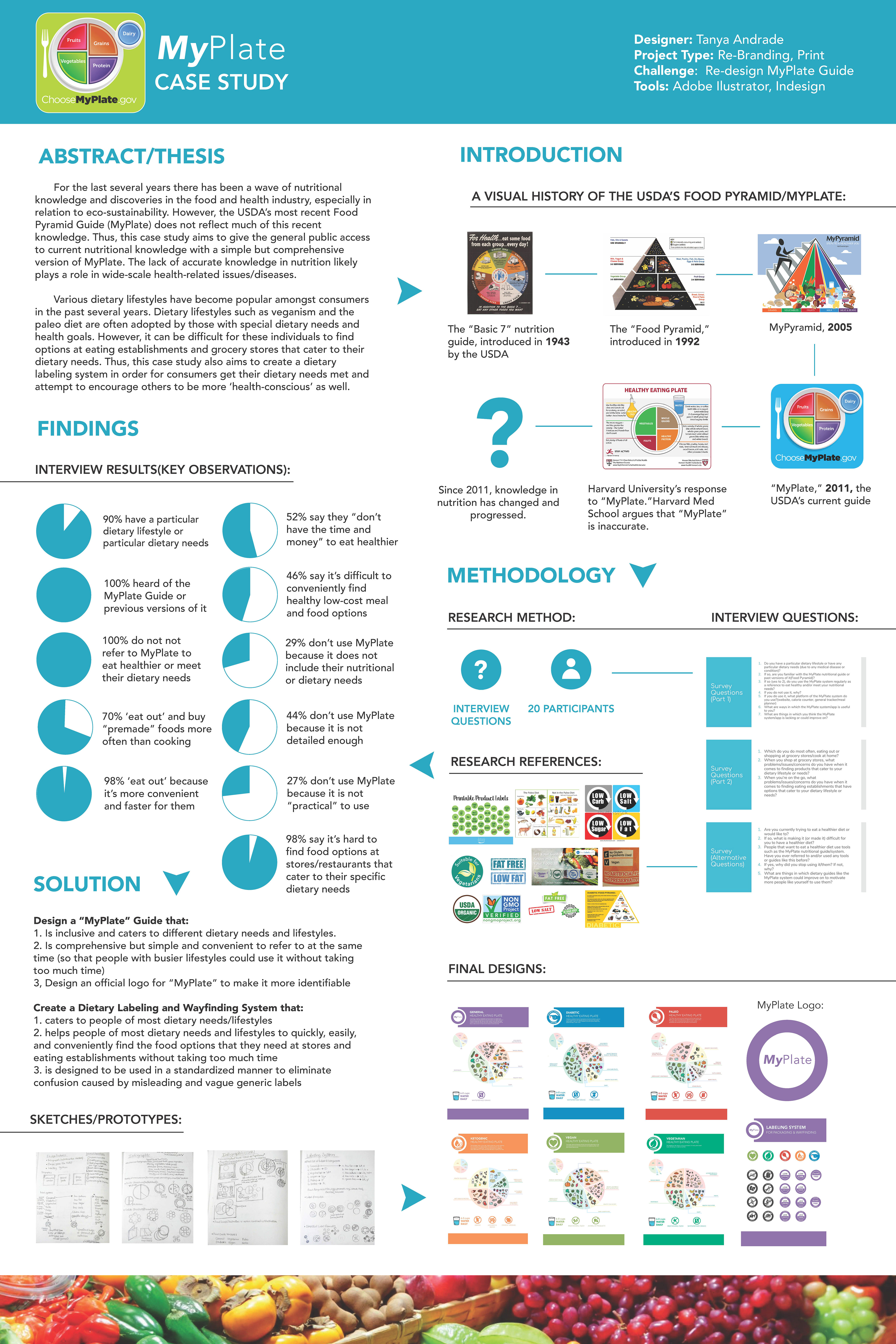 Due to the rise of new knowledge and discoveries in nutrition and health since 2010, a re-design of the USDA ‘MyPlate’ nutritional guide is crucial. This project/case study offers a revised, in-depth version of ‘MyPlate’ that reflects more recent knowledge in nutrition that is inclusive of different dietary “types” and lifestyles. It is necessary that the public (especially children) has access to a basic nutritional guide with a more visually engaging, effective, and comprehensive breakdown of their daily nutritional needs. The lack of up-to-date and accurate knowledge in nutrition plays a role in many health-related issues.