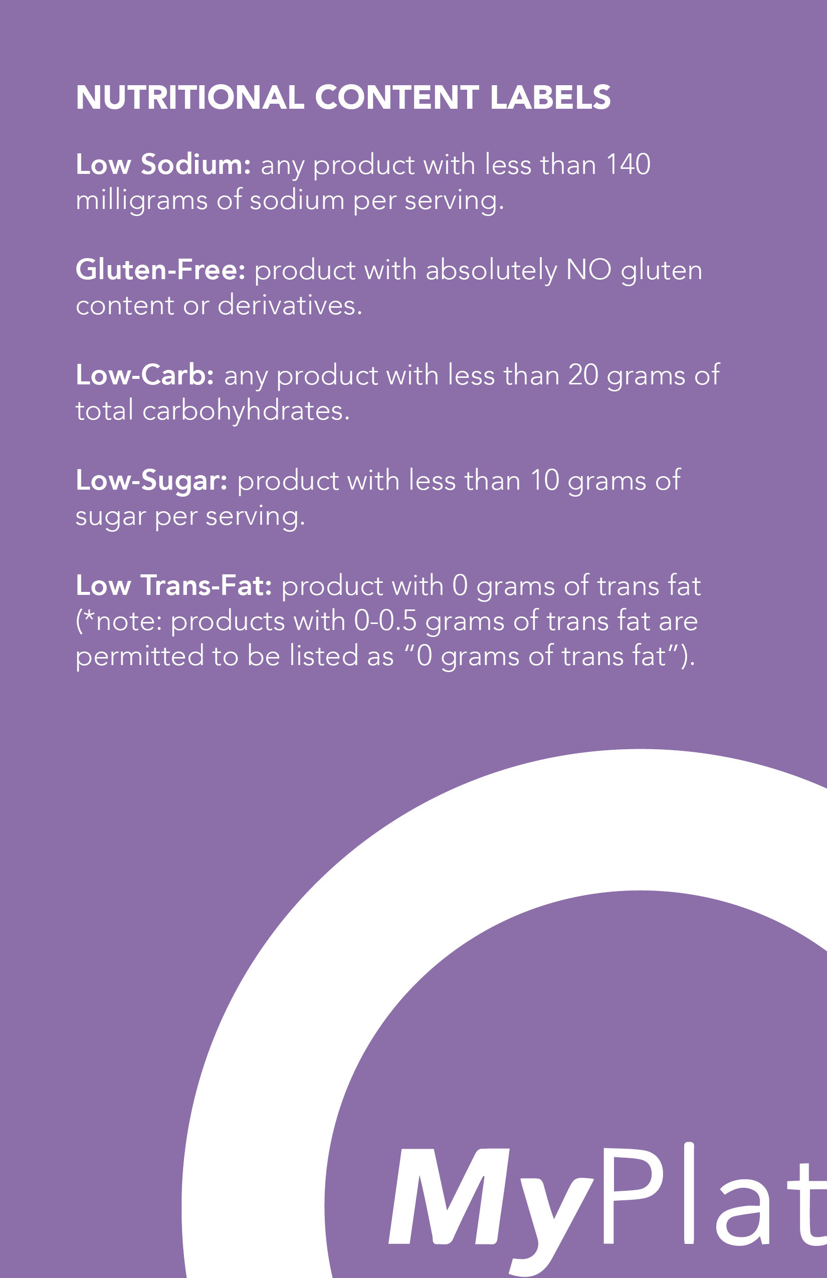 This project also introduces a new feature that is long overdue to be in the ‘MyPlate’ platform: An ‘official,’ standardized labeling system to help consumers get their particular nutritional/dietary needs met. It is often difficult for those with specific nutritional/dietary needs to find options at eating establishments and grocery stores in an efficient manner. Existing systems, such as generic labeling crafted by product companies, are often misleading about their nutritional or dietary claims.
